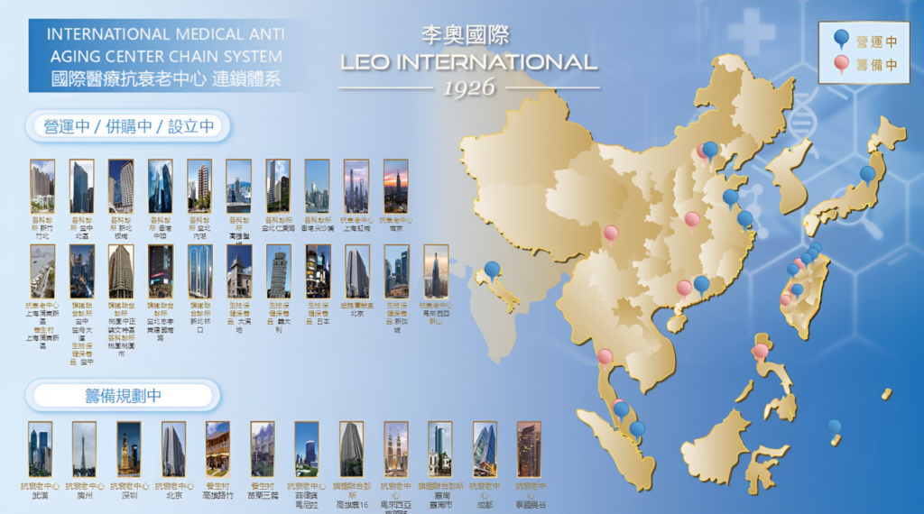 李奧國際集團以其領先的高端奢侈品管理經驗為基礎,積極拓展醫療市場,致力於成為亞太地區健康管理的領航者。集團目前在亞太多地設立醫療據點,包括台北的醫療總管理中心、北京的再生醫學中心以及上海的養生中心,並逐步擴展至吉隆坡、大溪地和廣州等城市。這些據點不僅是集團進軍醫療領域的重要橋頭堡,更是其整合全球頂尖醫療資源的樞紐。